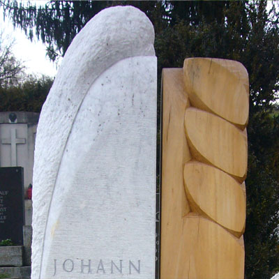 Die Planung und Ausführung dieses Grabmales erfolgte im Sinne der Lebenseinstellung des Verstorbenen. So wurden die Vergänglichkeit und der Glaube an einen Neubeginn mit einer Ähre aus Holz und die Beständigkeit des Lebens mit einem Engelsflügel aus Stein dargestellt.