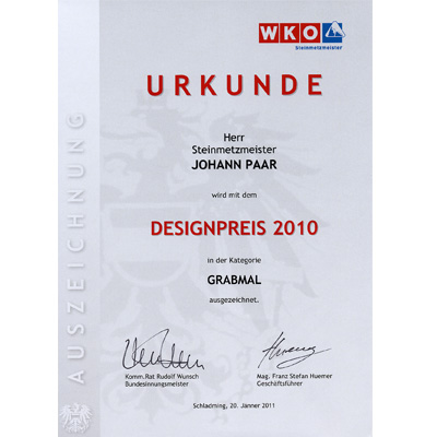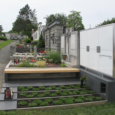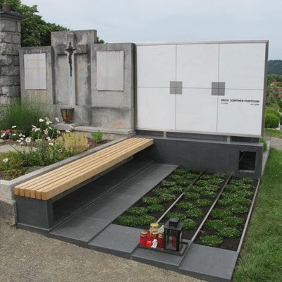 Die gesamte Konzeption und im Besonderen die Wandfläche wurde in klarer zurückhaltender Formensprache in Anlehnung an den Baustil des verstorbenen Architekten ausgeführt. Die Grabfläche ist begehbar und stufenförmig dem vorhandenen Gelände angepasst. Eine Sitzbank lädt zum Verweilen und zum Zwiegespräch mit dem Verstorbenen ein.